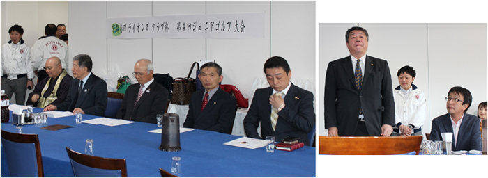 (左)大会委員長 京都鳥羽ライオンズクラブ会長L中嶋建治 開会式 (右)NPO京滋ジュニアゴルフクラブ副理事長金井吉郎様 大会競技委員長より大会要綱、ローカルルールの説明